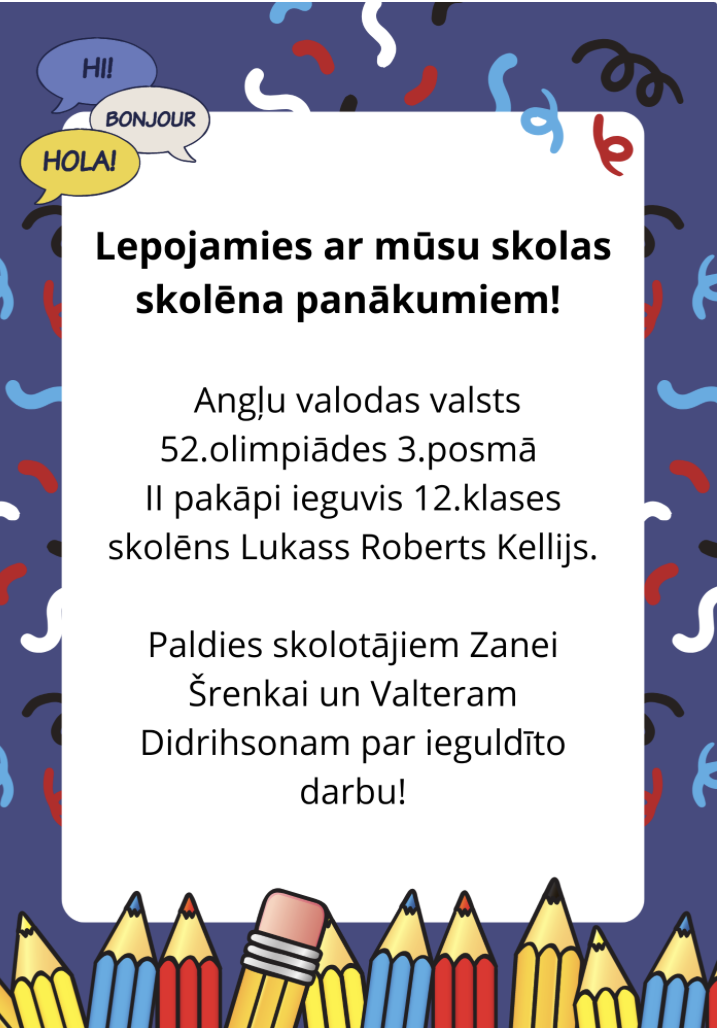 Published on02.01.2025SasniegumiSasniegumi Angļu valodas valsts 52.olimpiādes 3.posmā 23.02.2023. Share on social media