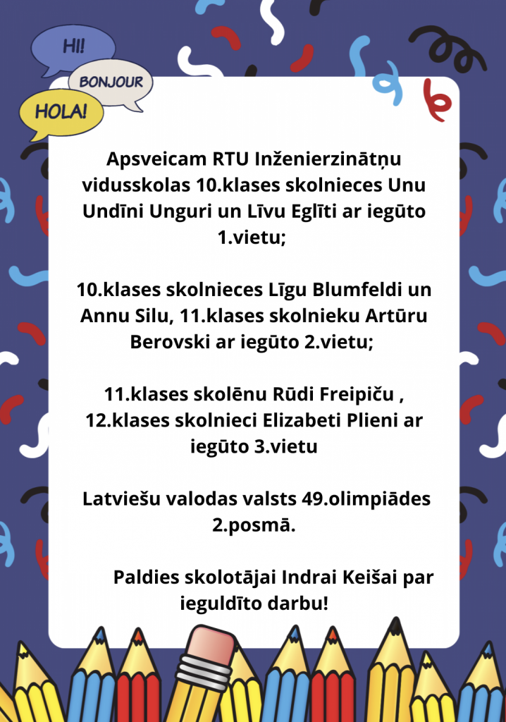 Published on02.01.2025SasniegumiSasniegumi Latviešu valodas valsts 49.olimpiādes 2.posmā 07.03.2023. Share on social media