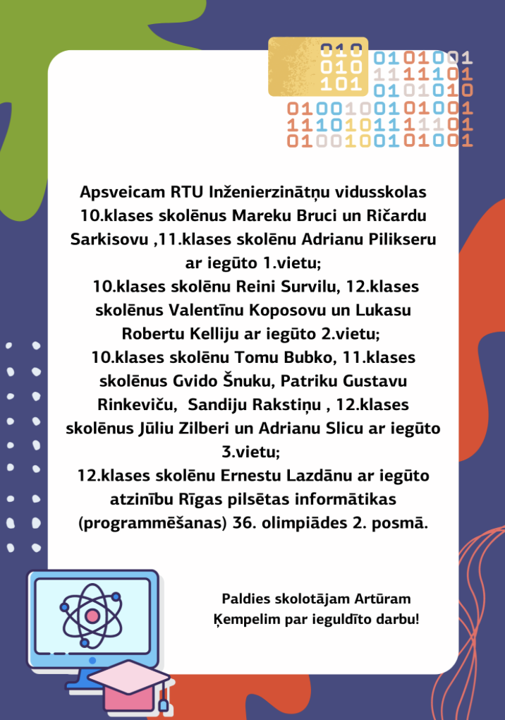 Published on02.01.2025SasniegumiSasniegumi Rīgas pilsētas informātikas (programmēšanas) 36. olimpiādes 2. posmā 25.01.2023. Share on social media